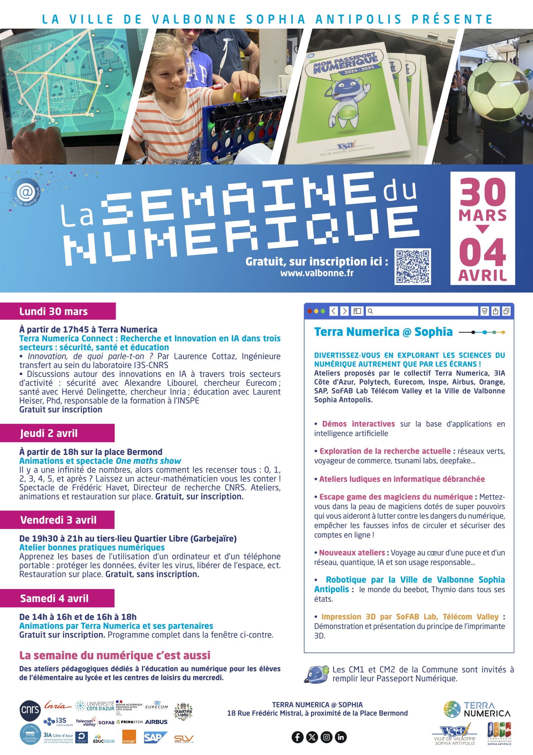 À Sophia Antipolis, Terra Numerica et ses partenaires vous invitent à une immersion dans l’univers du numérique et de l’IA. Au programme de ces 6 jours : démos interactives, ateliers ludiques en informatique débranché, escape game, voyage au coeur d’une puce et d’un réseau, quantique, robotique, impression 3D… Le programme est riche et varié !