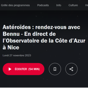Patrick Michel, chercheur CNRS, Guy Libourel, enseignant-chercheur et Héloïse Méheut, chercheuse CNRS au laboratoire Lagrange (CNRS-OCA-Université Côte d'Azur) font partie de l'équipe sélectionnée avec d'autres équipes internationales pour effectuer les premières analyses des échantillons de l'astéroïde Bennu. En direct de l’Observatoire de la Côte d’Azur à Nice, ils ont livré à France Inter/La Terre au Carré leurs premières observations.